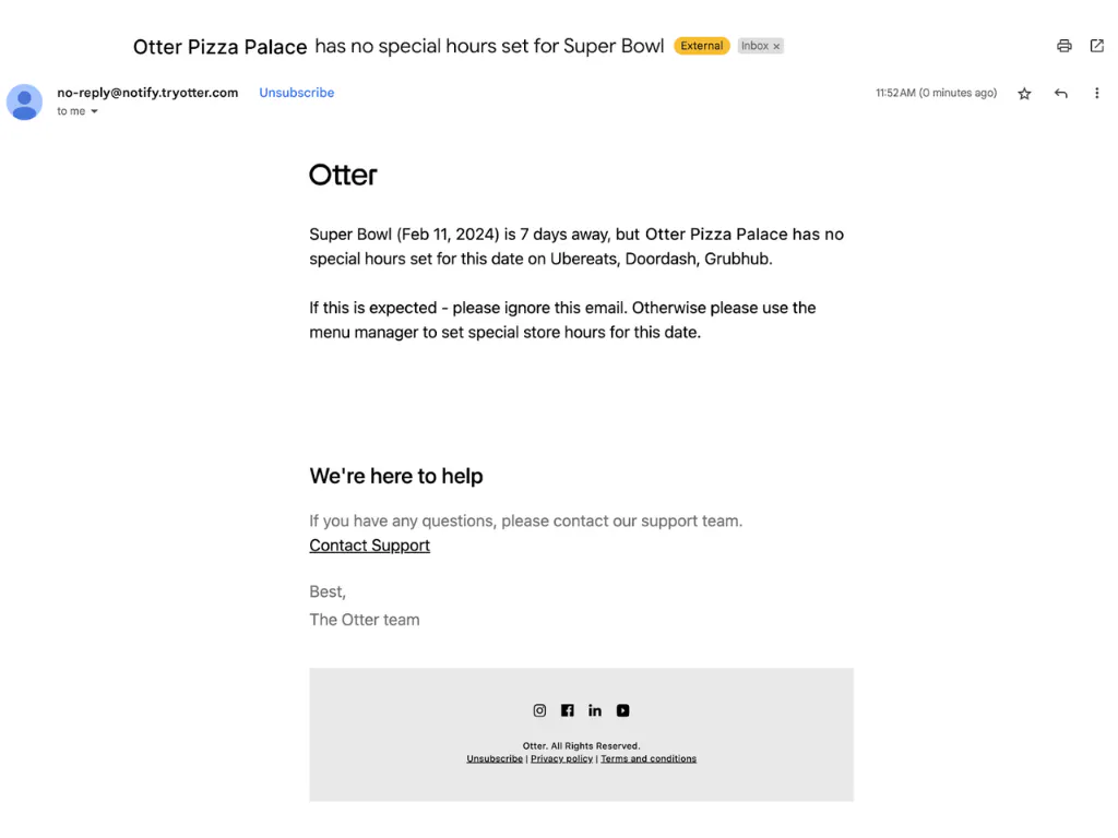 Forgot to set your store hours for an upcoming holiday or special occasion? Don’t worry. Live Alerts can now notify you of missing store hours ahead of special days so you don’t rack up cancellations. Opt in via your Otter Dashboard.