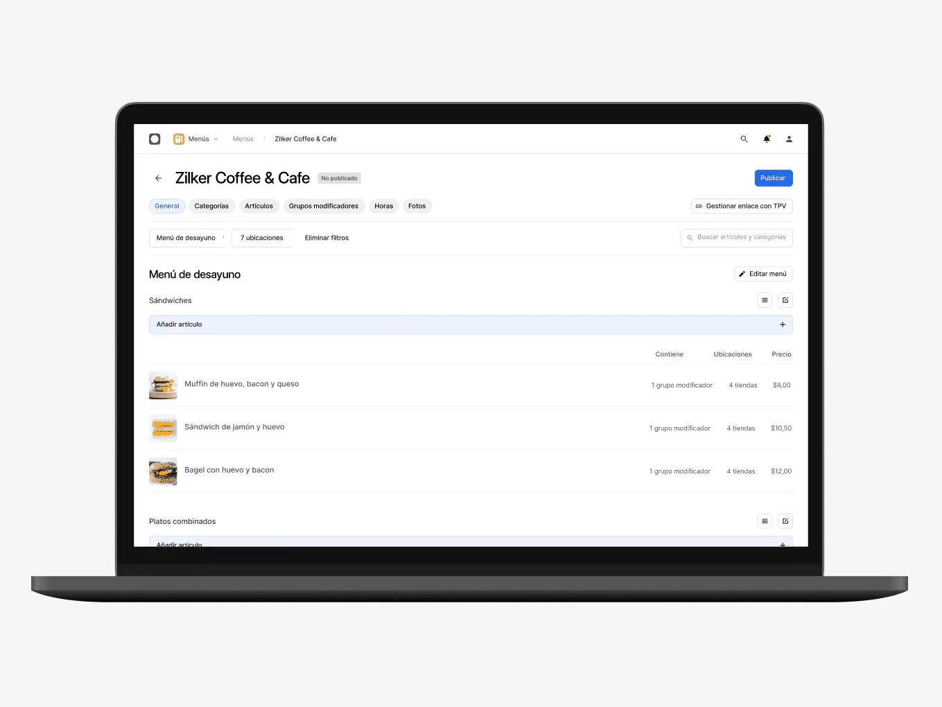 Sincroniza automáticamente tus menús, gestiónalos en todas tus ubicaciones y marca artículos como no disponibles en tiempo real.