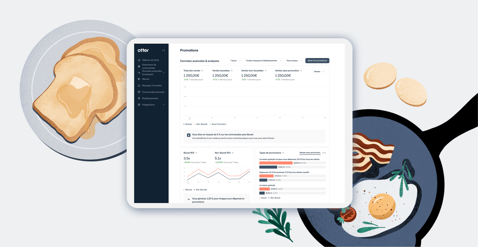 Promotions est le nouvel outil marketing d'Otter. C'est une solution promotionnelle complète et entièrement personnalisable pour vous aider à tirer le meilleur parti des offres, remises et promotions sur les principales applications de livraison. Grâce à un processus complexe d'apprentissage automatique, Promotions analyse votre menu, les détails de votre activité et vos performances sur les différentes plateformes, afin de pouvoir créer et développer des promotions stratégiques et personnalisées.