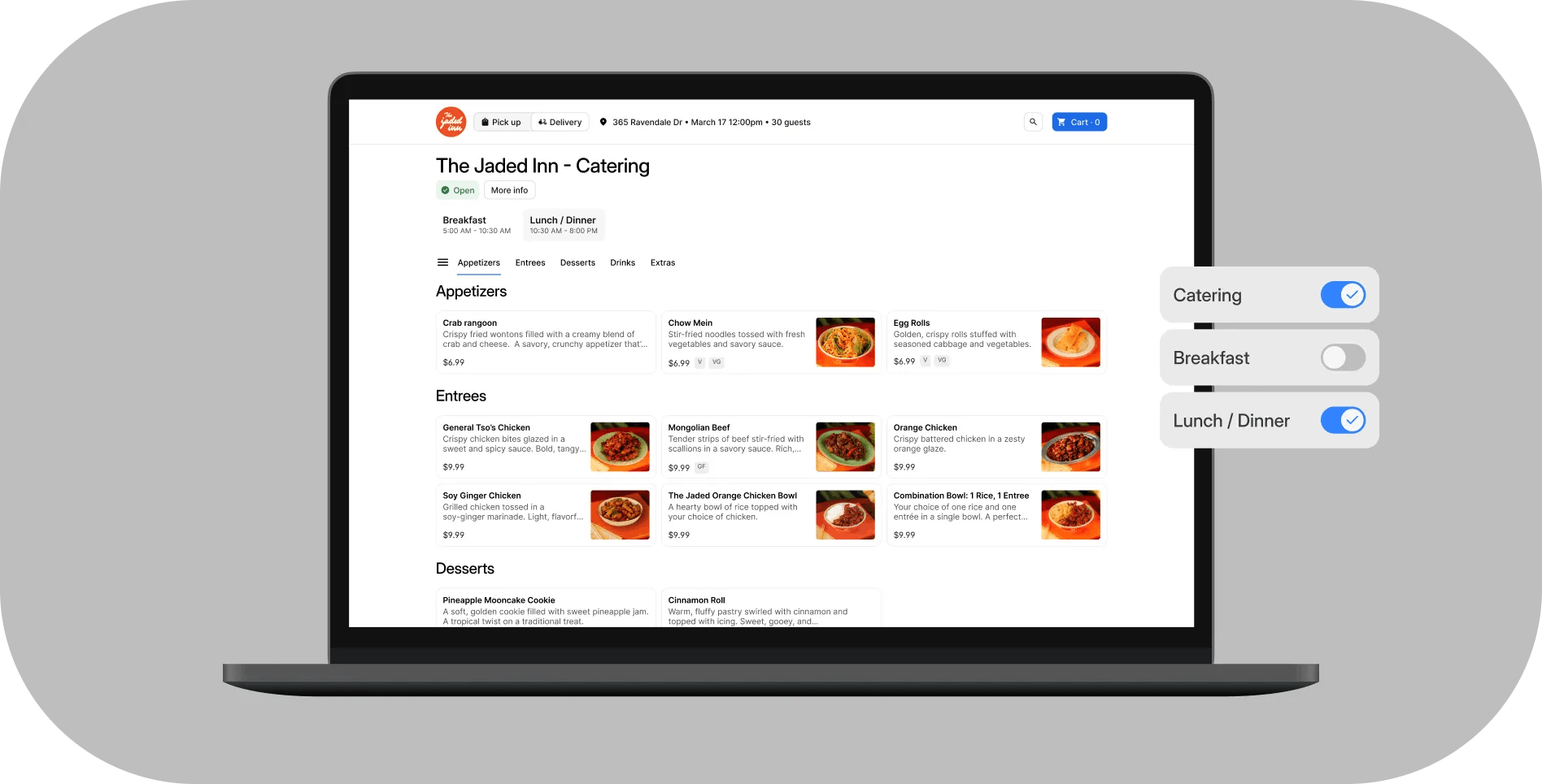 Promote catering directly on your site with a beautiful, mobile-friendly experience that’s always up to date