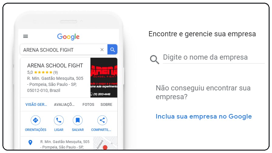 2. Informe o nome do seu negócio e as opções aparecerão em um menu suspenso. Você poderá selecionar o nome do seu restaurante nas opções dessa lista. Caso não apareça, é só selecionar “Inclua sua empresa no Google”