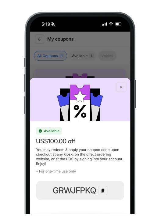 What’s new: You and your loyalty program members can now generate coupon codes that they can use whenever they order from any of your ordering channels. They can opt to use their points for discounts or convert them to cash credit at your restaurant. All they need to do is log in to their loyalty portal with their account and generate coupon codes using their points. These codes can then be used whenever they order online, in-store, or at a kiosk.