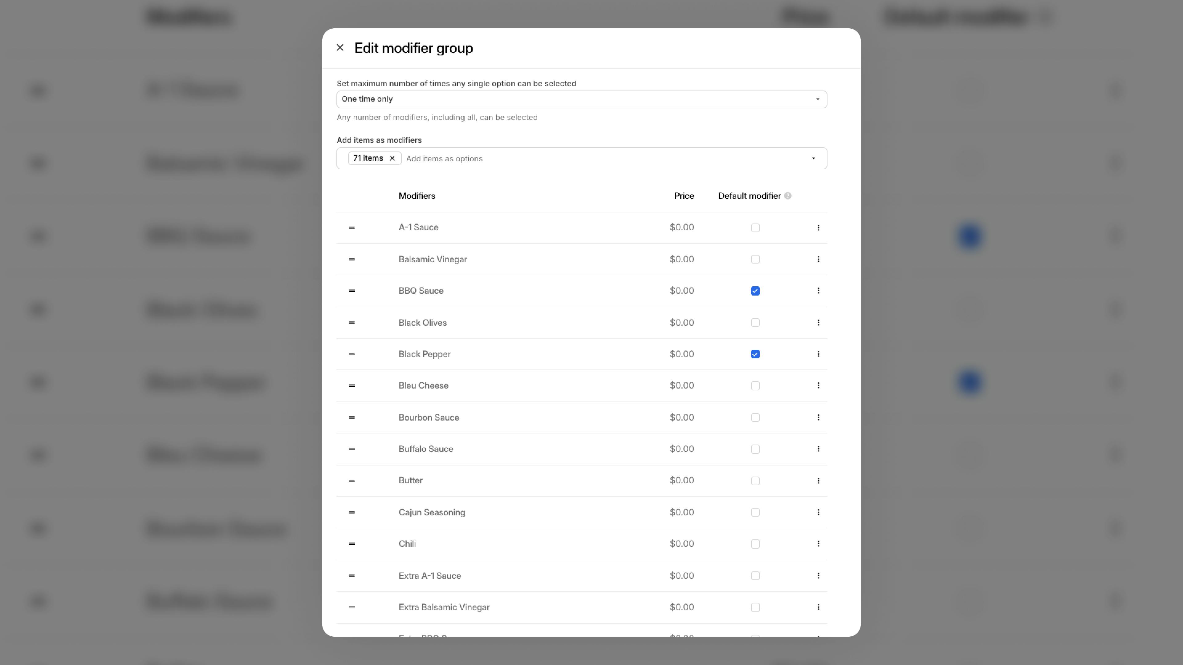 What’s new: Define standard modifier selections that automatically apply when a menu item is selected. For example, when a customer orders a pizza, black olives and BBQ sauce can be set as default. Just update your modifier group in the Menus app.