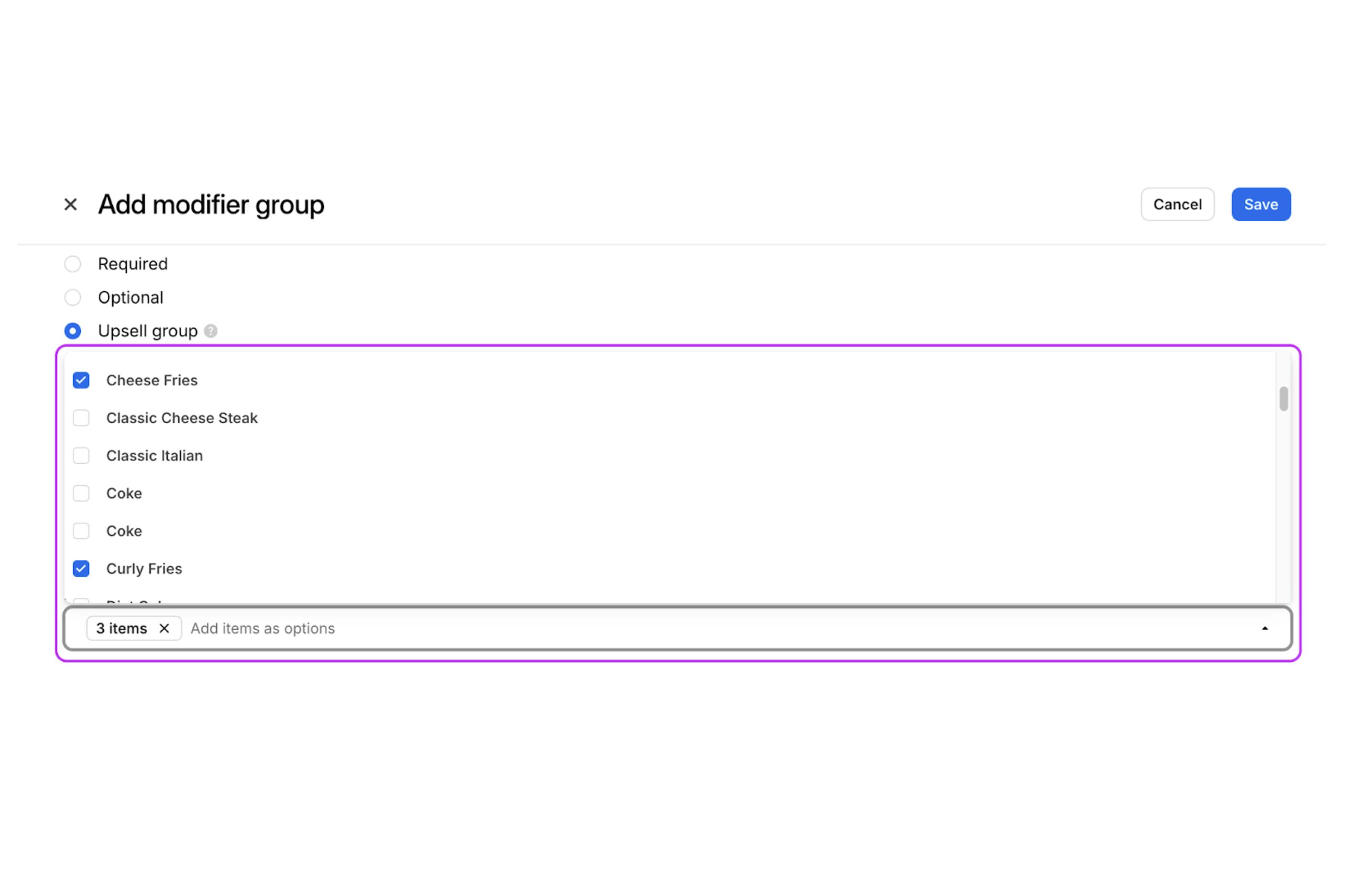 Just create a group, assign the upsell items, and publish across your delivery platforms or in-store kiosk menus.