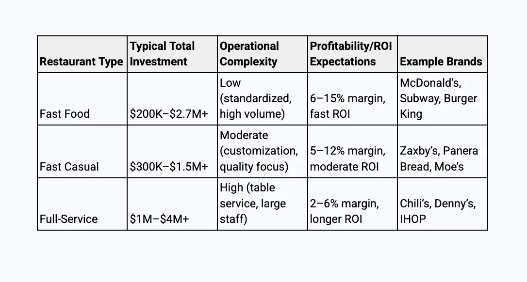 Full-service restaurants generally operate with thinner profit margins and longer ROI timelines, but can generate higher total sales volumes when well-managed and located in high-traffic areas.