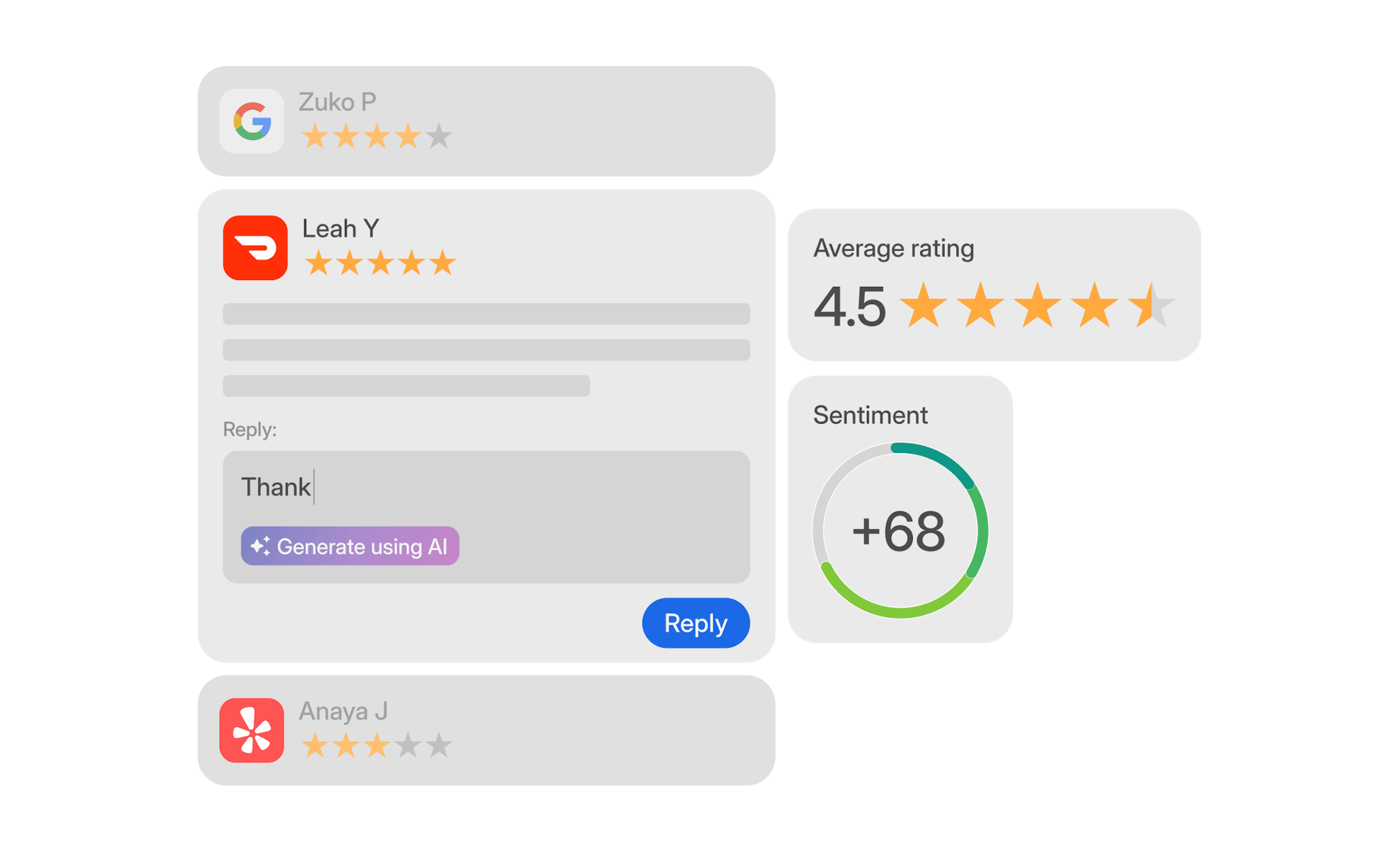All-in-one online reputation management platforms like Otter Ratings & Reviews—where you can monitor all your restaurant reviews from a single dashboard—as well as ReviewTrackers and Podium aggregate new reviews from Google, Yelp, Facebook, TripAdvisor, and other review sites into single dashboards. These tools typically offer response templates, automated review requests, and analytics that reveal trends in customer sentiment.
