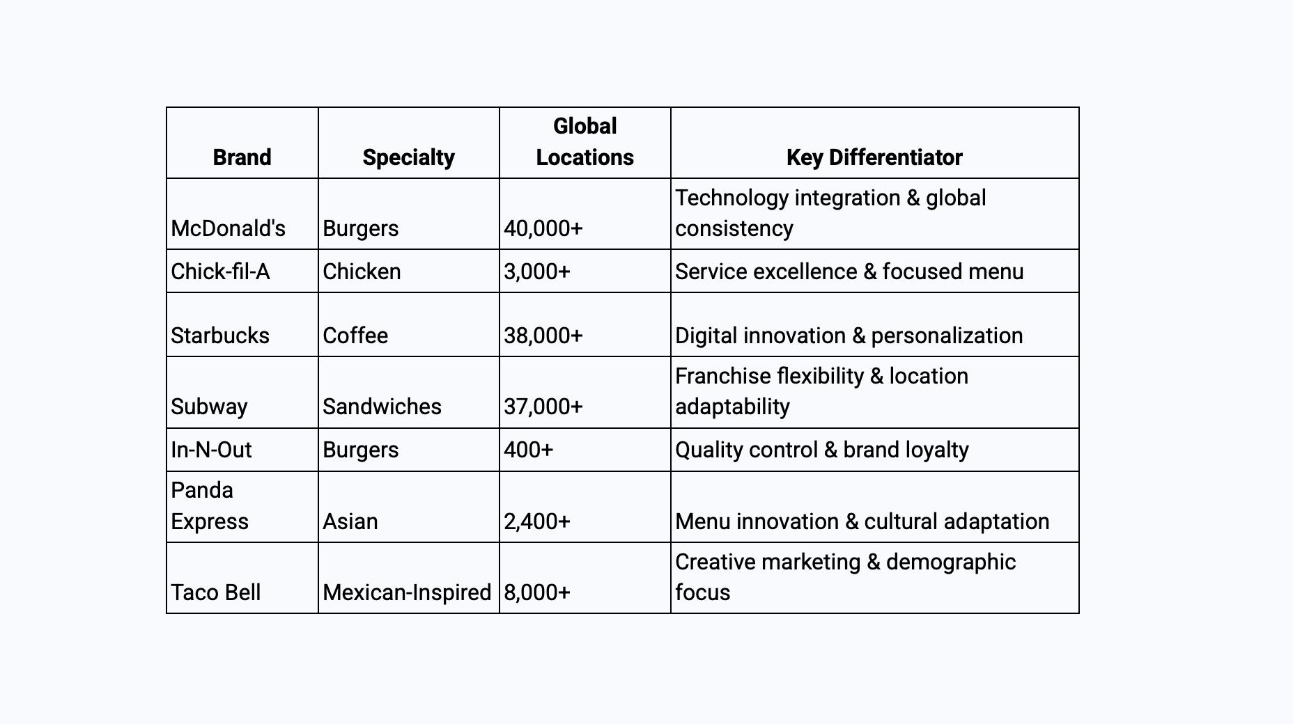 Overview: With over 38,000 stores worldwide, Starbucks blends QSR efficiency with café ambiance, using a mix of company-owned and licensed locations to adapt to local markets and dining options.