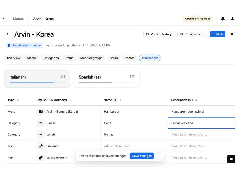 Kiosk customers can now translate their menus into different languages. Add multiple translations to each of your items and their descriptions easily in bulk.
