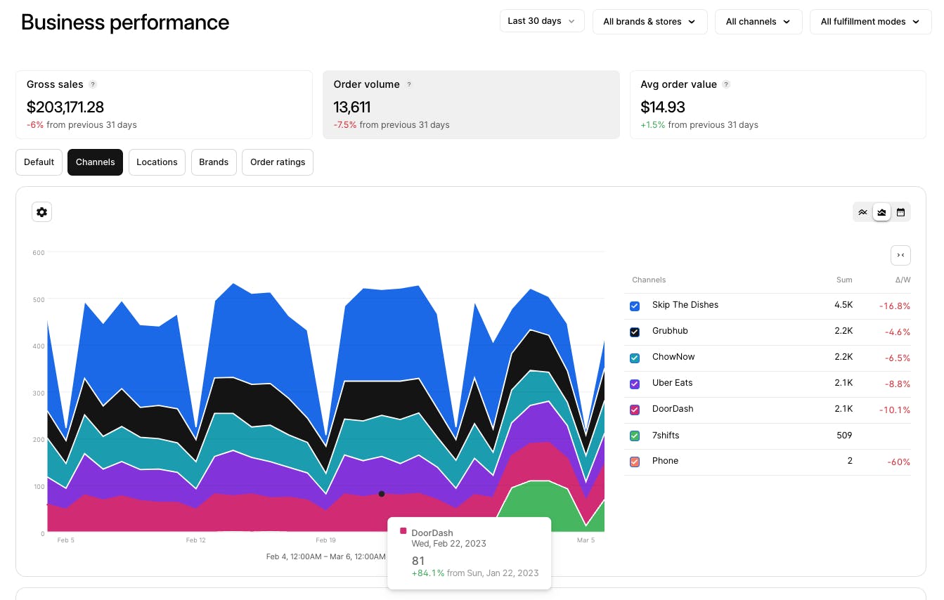 Use this tab to review sales and orders across all of your stores and channels. In this tab, you can see your complete Business Performance, Store Ranking, Channel Performance, and Fulfillment Performance. You can narrow down this information by location, timeframe, delivery app, and more by using the menus at the top of each block.