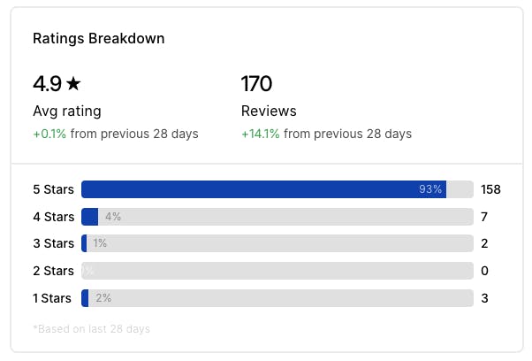 Advanced Analytics and Pro users have access to the Ratings & Reviews tab: a consolidated overview of customer feedback from across all of your delivery partners. Use the Ratings Breakdown, Average Weekly Ratings, and Store Ratings blocks to see what your customers think of your business.