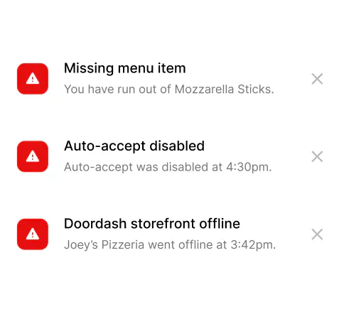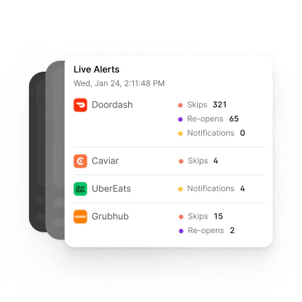 Simply connect your Uber Eats, DoorDash, and Grubhub accounts to start receiving issue alerts