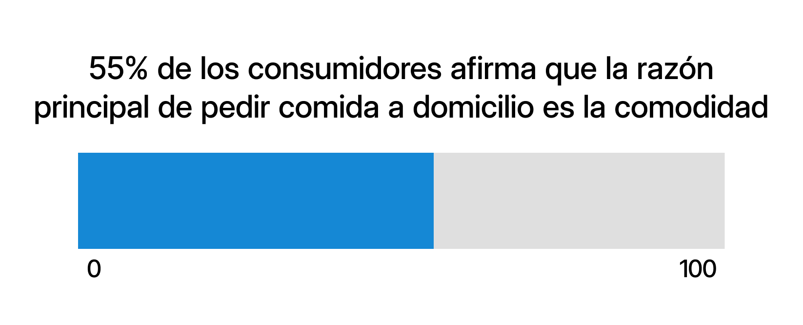 - El 55% de los consumidores afirma que la comodidad es la principal razón por la que piden comida por internet, mientras que el 45% dice que lo hace como recompensa o capricho.