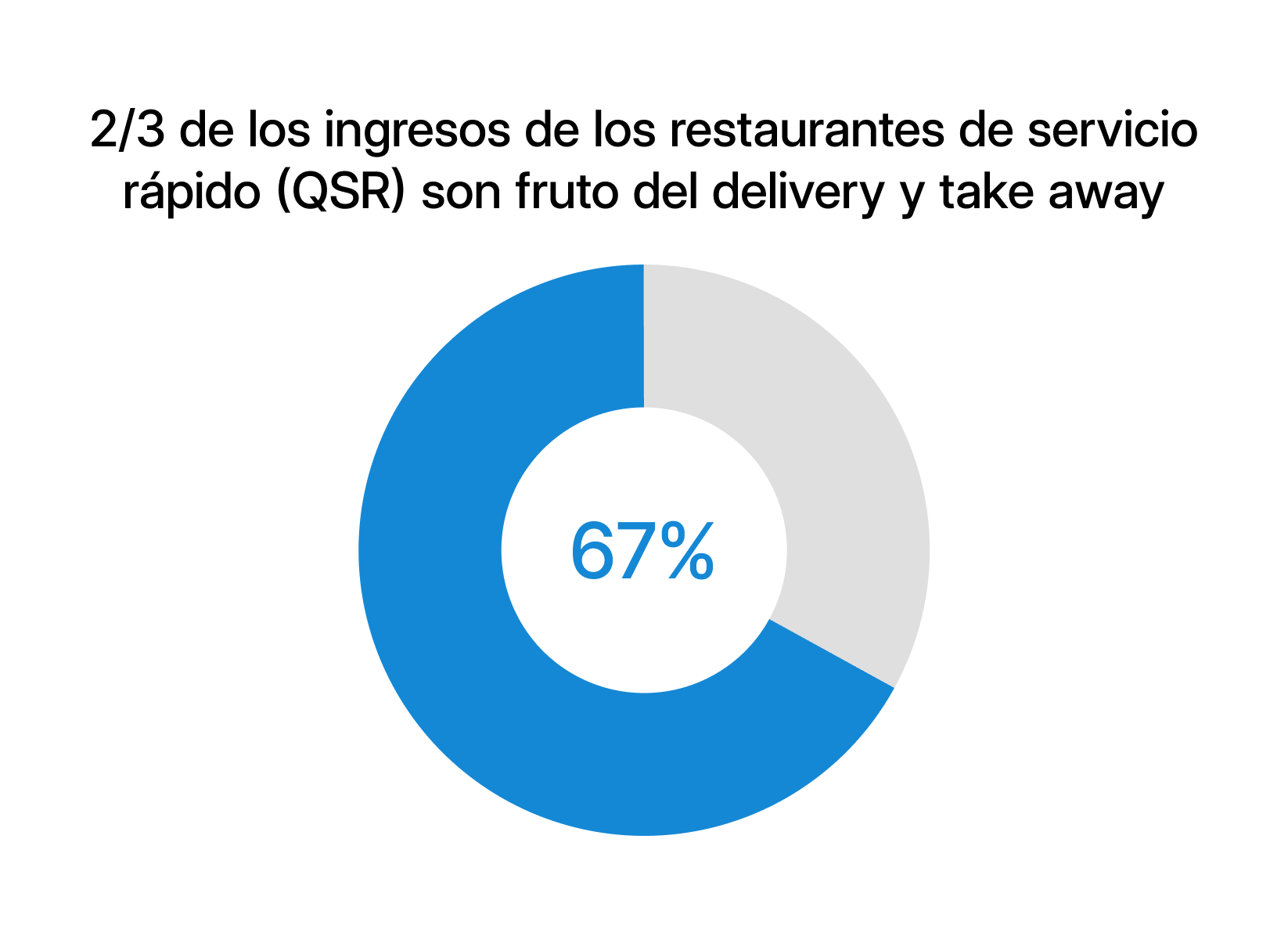 - Si nos fijamos en los distintos tipos de restaurantes, los de servicio rápido (quick service restaurants) son, con diferencia, los más populares y los que más dependen del reparto de comida a domicilio. Dos tercios (67%) de los ingresos totales de los restaurantes de servicio rápido proceden de la entrega y recogida de comida, mientras que el 33% restante procede de las ventas en el restaurante.