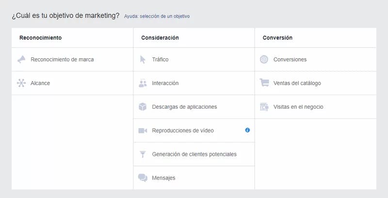 Estos son algunos de los objetivos o metas de Facebook que debes considerar elegir para tu restaurante: