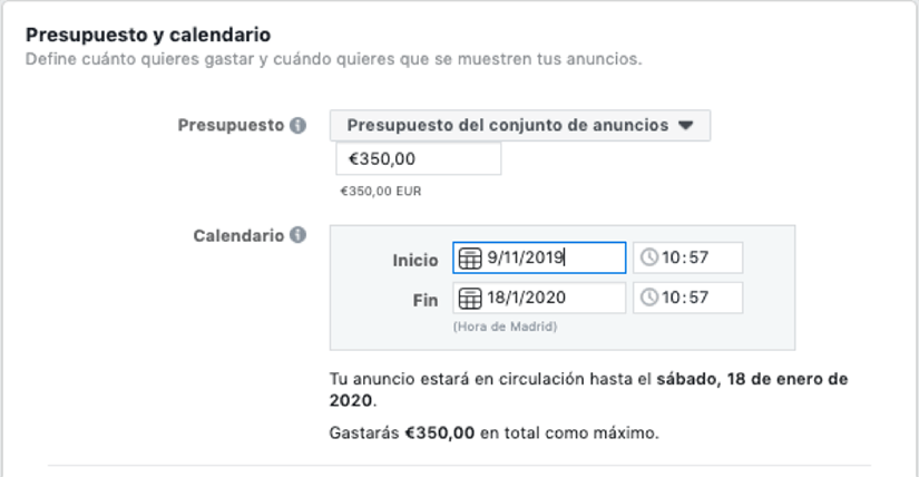 Asegúrate de agregar también una fecha de inicio y finalización, además de establecer tu presupuesto como un presupuesto "de por vida". Si colocas tu presupuesto como un presupuesto diario, gastarás todo el dinero que destinaste en 24 horas. Este es un error común y frustrante, ¡Así que verifica antes de seguir con el siguiente paso!