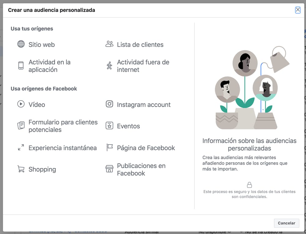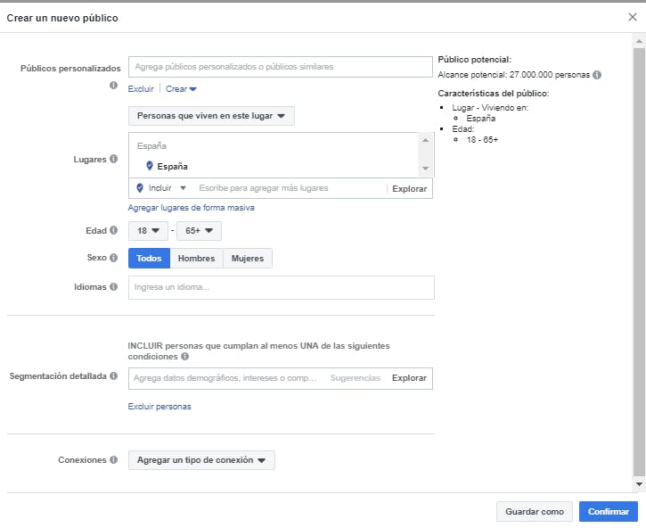 Cuando se trata de crear audiencia, ¡Considera usar los clientes que ya tienes! Puedes utilizar tu lista de clientes actual (su correo electrónico, número de teléfono, nombre y apellido) y crear un público basado en esa audiencia. Una vez más, todo se reduce a lo que estás tratando de lograr. Examina los datos demográficos de Facebook por interés, me gusta, edad, género y más. Asegúrate de guardar tu audiencia para que puedas volver a usarla después.