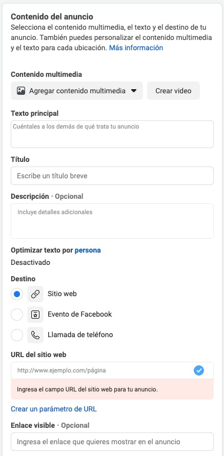 La parte más importante de tu anuncio es la URL del sitio web y los CTA (Call to Action/ Llamada a la Acción). Considera hacia dónde quieres llevar a tu audiencia: ¿Es su menú nuevo y mejorado? Si es así, tu CTA podría ser "Ver menú". ¿Son pedidos para llevar en las aplicaciones de entrega? Si es así, su CTA sería "Ordene ahora" con un enlace al sitio web donde los clientes pueden ordenar, etc.
