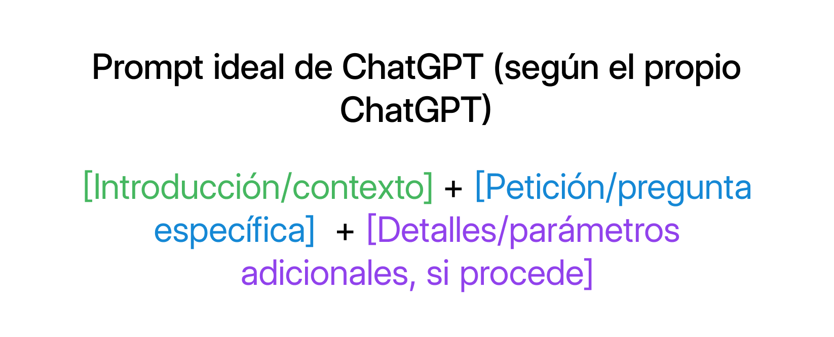 Aunque no existe una fórmula específica para el mensaje ChatGPT perfecto, puedes ceñirte a una estructura general para aumentar la probabilidad de obtener respuestas relevantes. El propio ChatGPT recomienda lo siguiente: