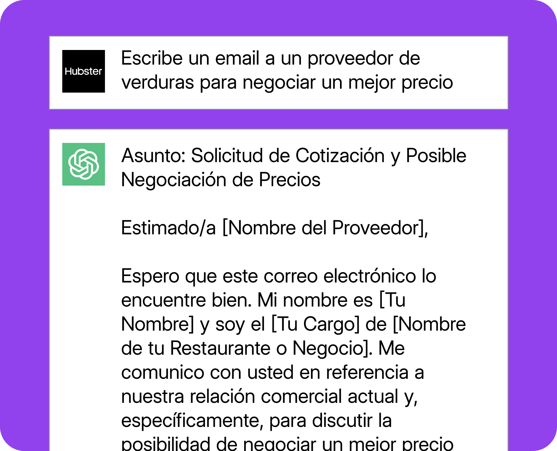 - Escribe un correo electrónico a un proveedor de [INGREDIENTE/S] de un restaurante para negociar [MEJOR PRECIO / CONDICIONES DE PAGO / TIEMPOS DE ENTREGA]. Esboza claramente los requisitos y explica los beneficios potenciales de los cambios propuestos.