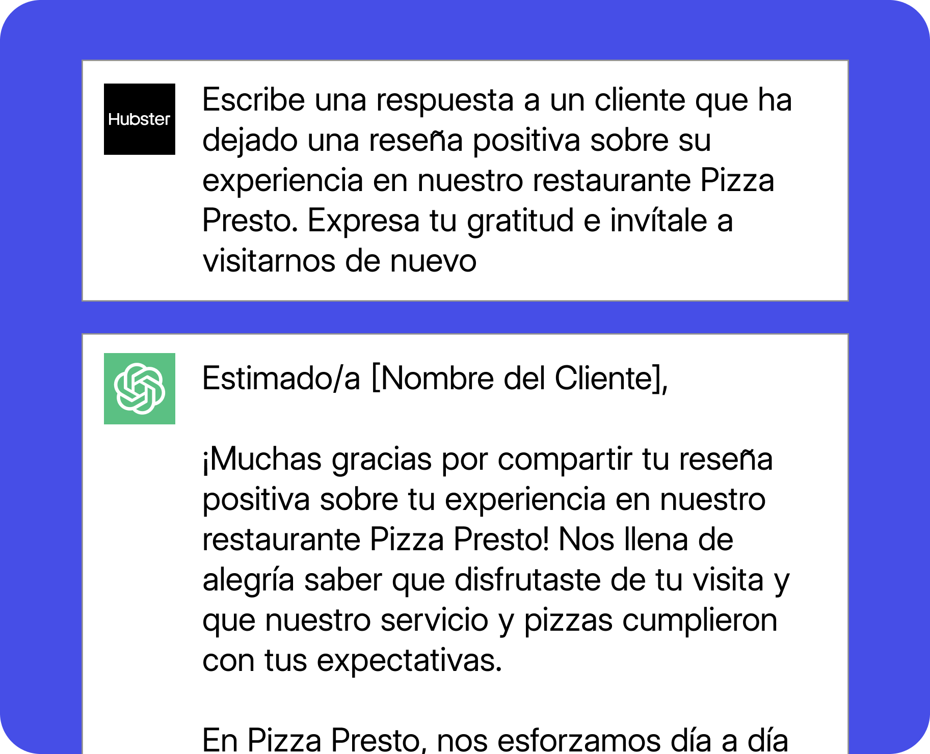 Consejo: Al igual que con los correos electrónicos, puedes dar a ChatGPT una reseña específica de tu restaurante y pedirle que responda. Prueba con algo como "Quiero que escribas una respuesta a una reseña que un cliente ha dejado sobre mi restaurante. Te proporcionaré la reseña y tú escribirás una respuesta que incluya [cualquier cosa que quieras mencionar en tu respuesta"].