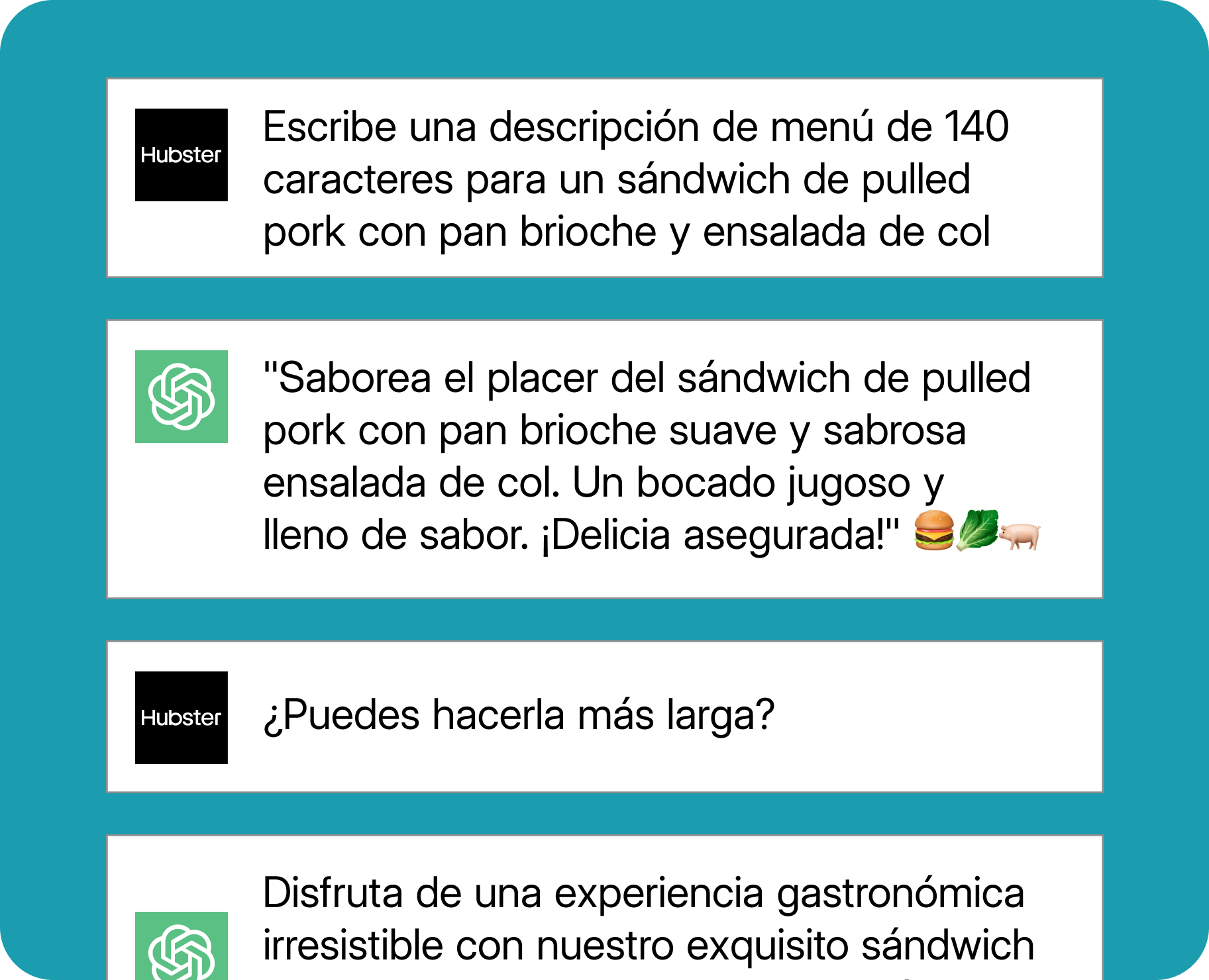 Piensa en ello. Hay una gran diferencia entre escribir "Escribe una descripción de menú para un sándwich de pulled pork" y "Escribe una descripción de menú de unos 200 caracteres para un sándwich de pulled pork con pan artesano, ensalada de col y salsa barbacoa".