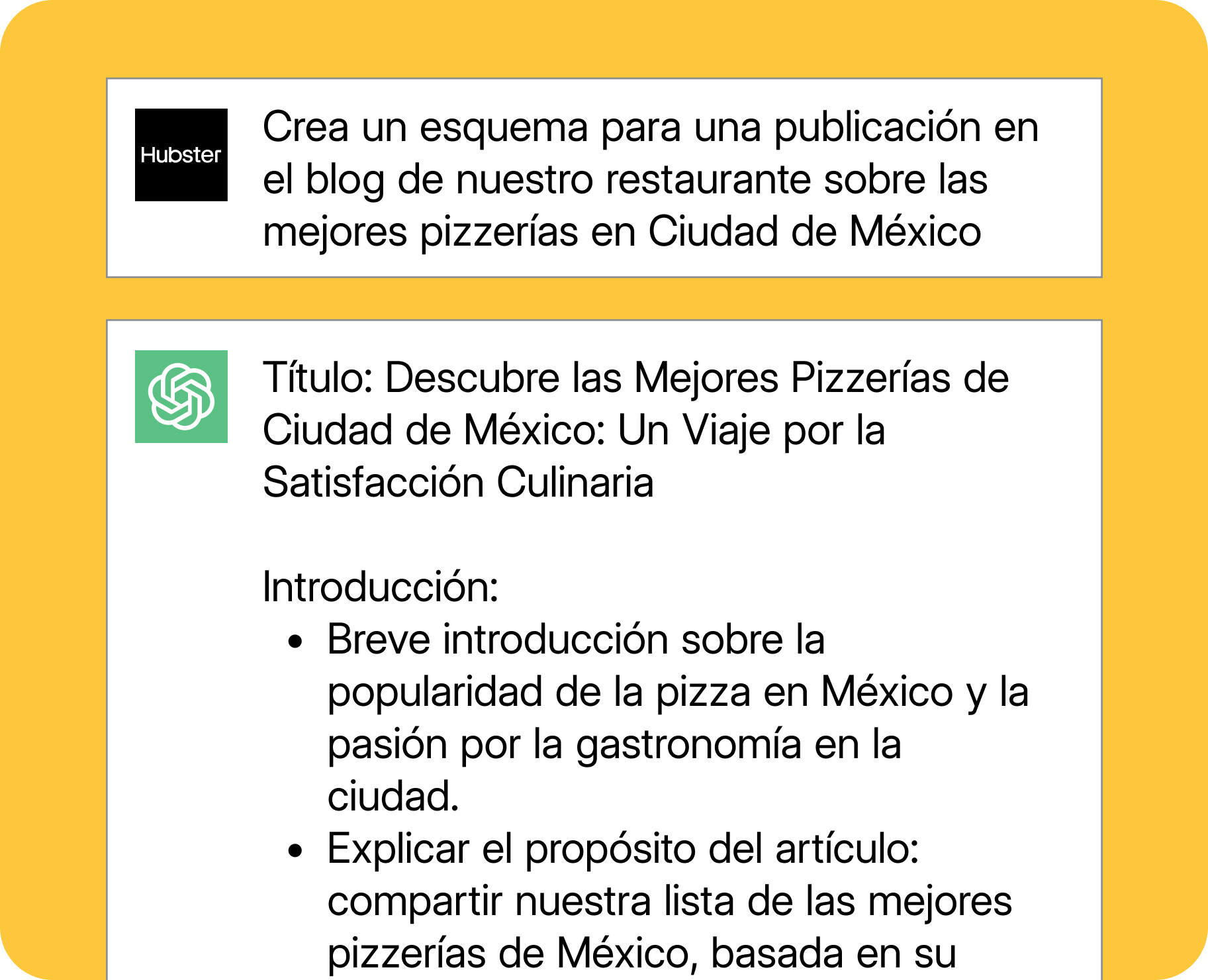 - Crear un esquema para una entrada de blog sobre [TEMA] para el blog de nuestro restaurante.
