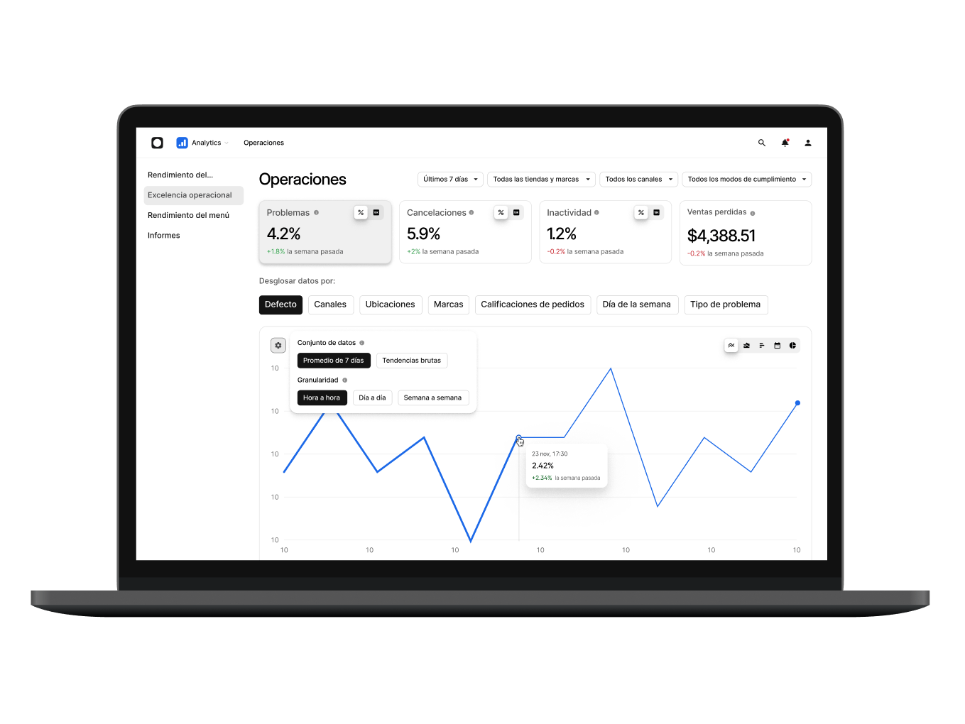 Controla las ventas, el volumen de pedidos, los datos financieros y todo lo que necesites para seguir y ajustar el rendimiento de tu restaurante sobre la marcha.
