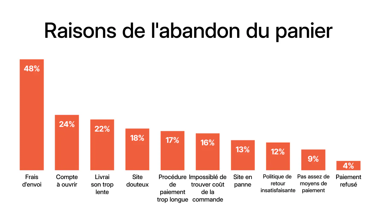 Selon une étude du Baymard Institute,69,99% de tous les paniers d'achat finissent par être abandonnés. Cela signifie qu'une grande majorité des acheteurs ne vont pas jusqu'au bout de leur achat, malgré un intérêt réel pour les produits. The Baynard Institute a identifié plusieurs raisons expliquant pourquoi les acheteurs abandonnent leurs paniers. Voici quelques-unes des principales raisons et comment vous pouvez éviter ces abandons :