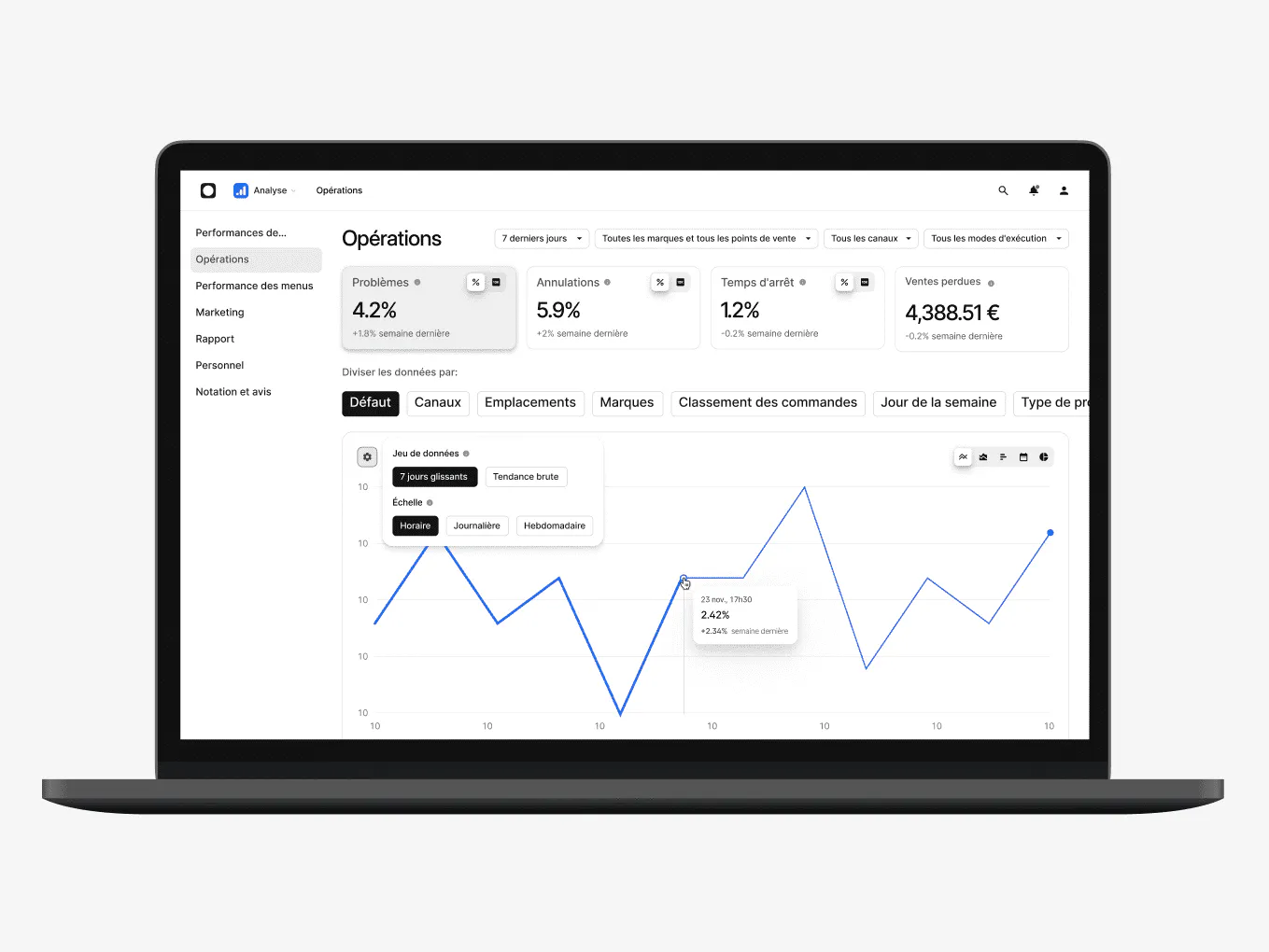 Lancez des promotions alimentées par l'IA, spécifiquement adaptées à votre public, réagissez aux avis clients pour améliorer votre score sur les plateformes de livraison et stimuler les ventes dans l'ensemble de vos établissements.