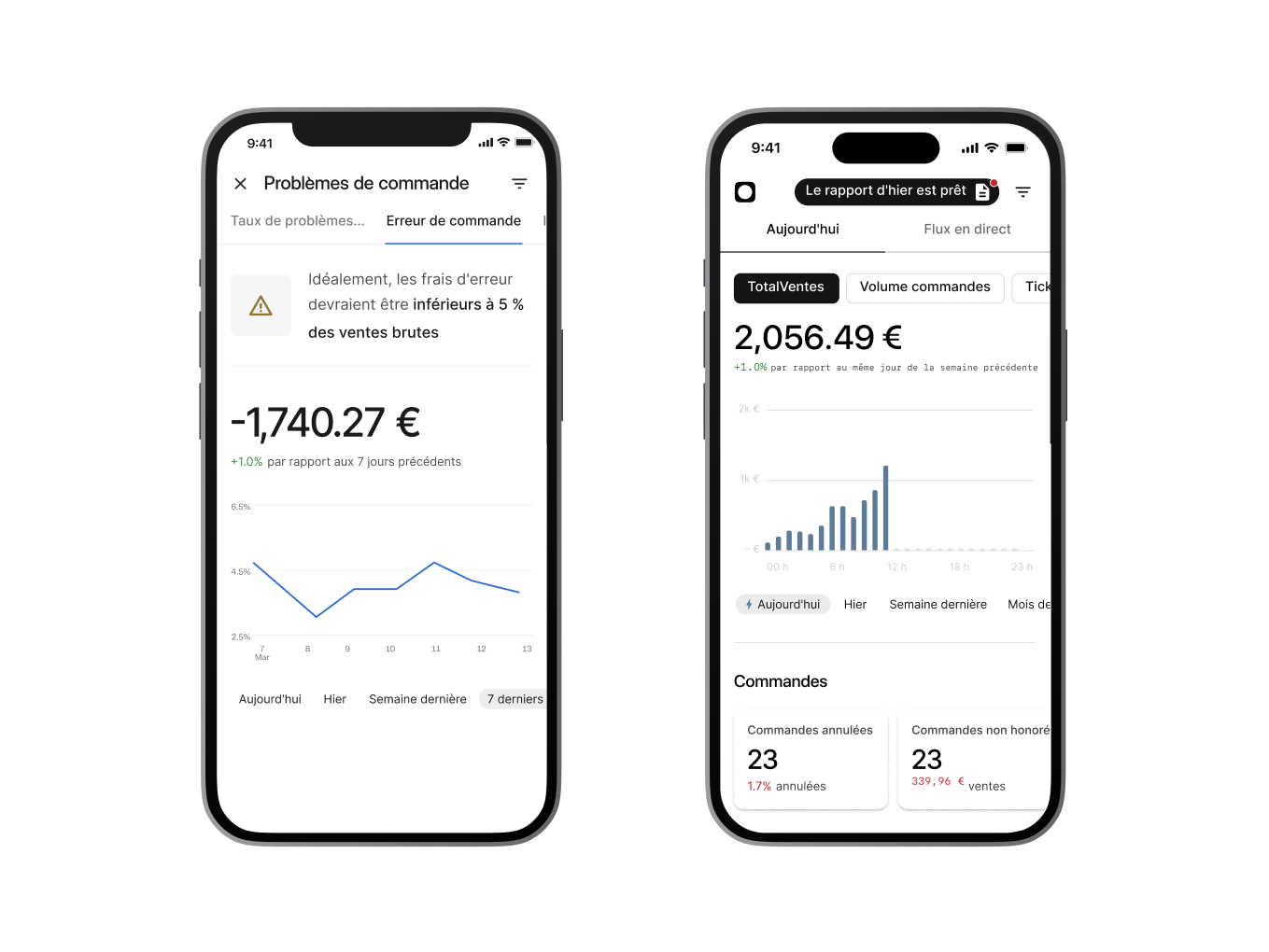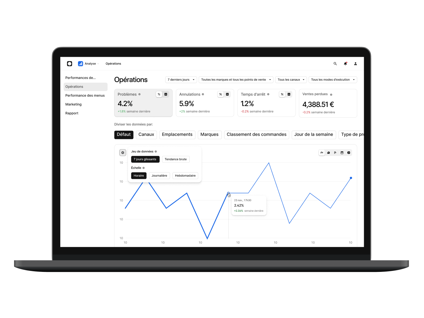 Surveillez les ventes, le volume des commandes, les données financières et tout ce dont vous avez besoin pour suivre et ajuster les performances de votre restaurant, où que vous soyez.