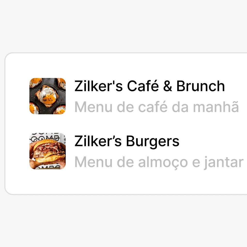 Separe os cardápios por categoria, como café da manhã, almoço e jantar. Varie os cardápios por loja e mantenha as alterações sincronizadas à medida que as coisas evoluem.