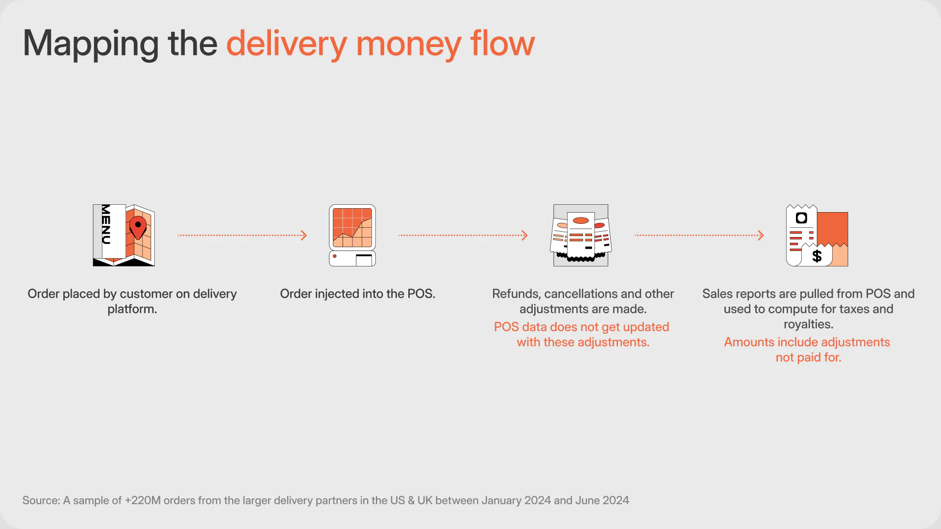 All of this places a heavy burden on finance teams. Many restaurants spend several days each month manually combing through reports, cross-checking transactions, and correcting discrepancies. For larger operators—franchises, multi-unit groups, and multi-state brands—the risks multiply with volume. Thousands of weekly orders across different markets and platforms increase the likelihood of missed adjustments, delayed reconciliations, and inaccurate royalty or tax allocations. Studies show that especially at scale, operators can lose up to 5% of net sales to unresolved delivery errors and adjustments.