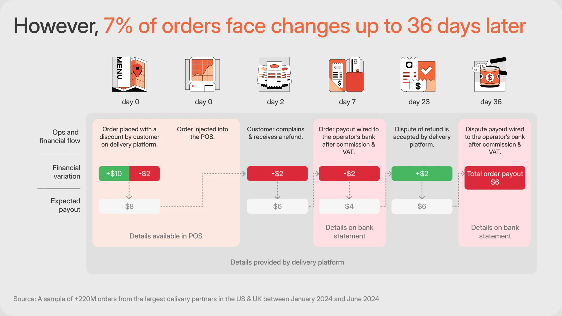 The glossy success story of online food delivery hides a tricky reality: orders only translate to profits if they stay on top of every fee, deduction, and adjustment that comes along with the sale. Those include chargebacks, cancellations, delayed refunds, bag fees, promotional deductions– the list is long and these adjustments can be difficult to track– especially when many of them can sometimes come as late as a month or more after the sale.