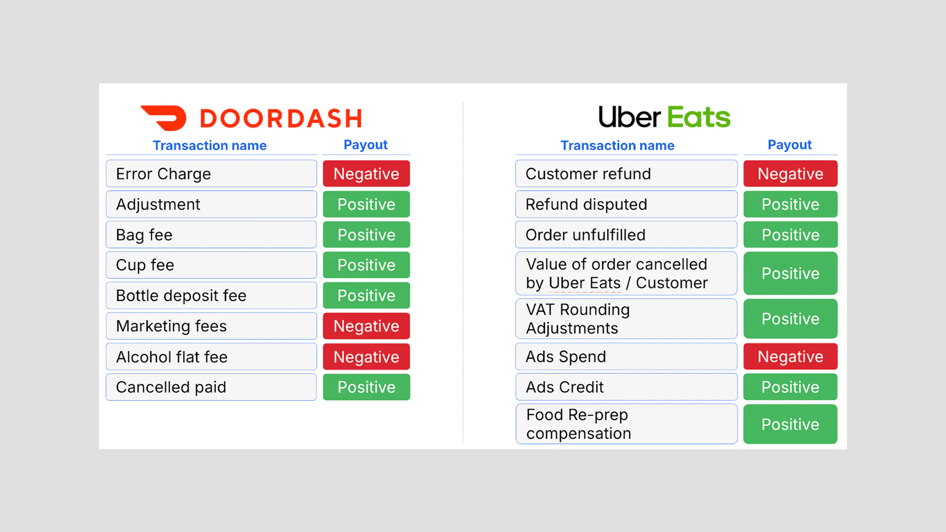 - Nomenclature: Every delivery platform labels fees/adjustments differently.