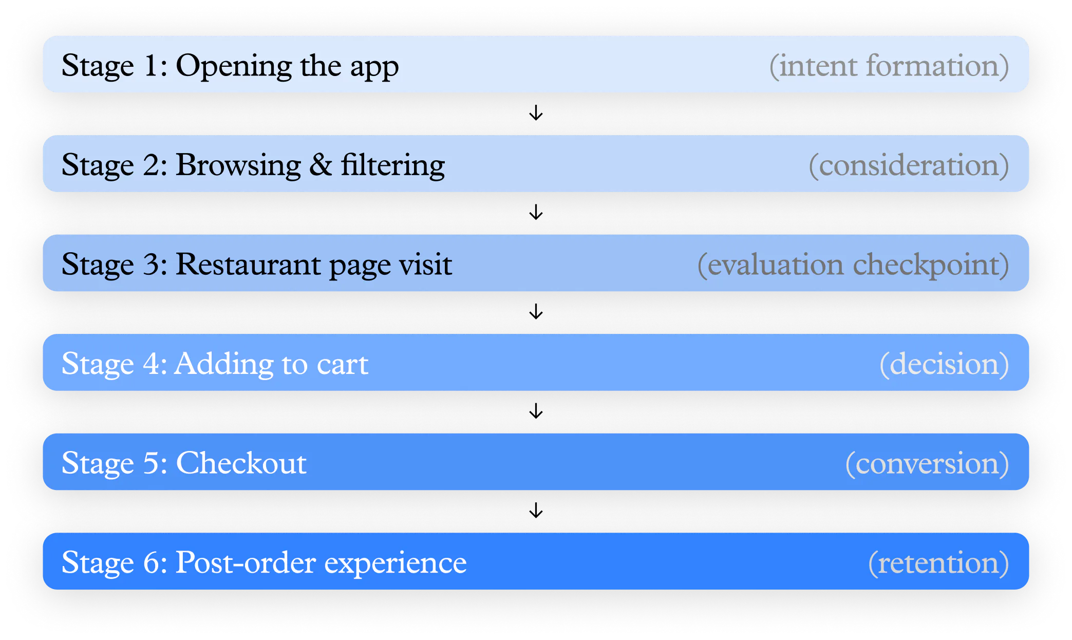 Most fall somewhere in between: hungry with a general craving, but open to persuasion. At this stage, the platform's homepage carousel, personalized recommendations based on previous ordering patterns, and category browsing features influence what they are shown when they enter the app or search. Restaurants featured prominently here capture attention before customers even begin searching.