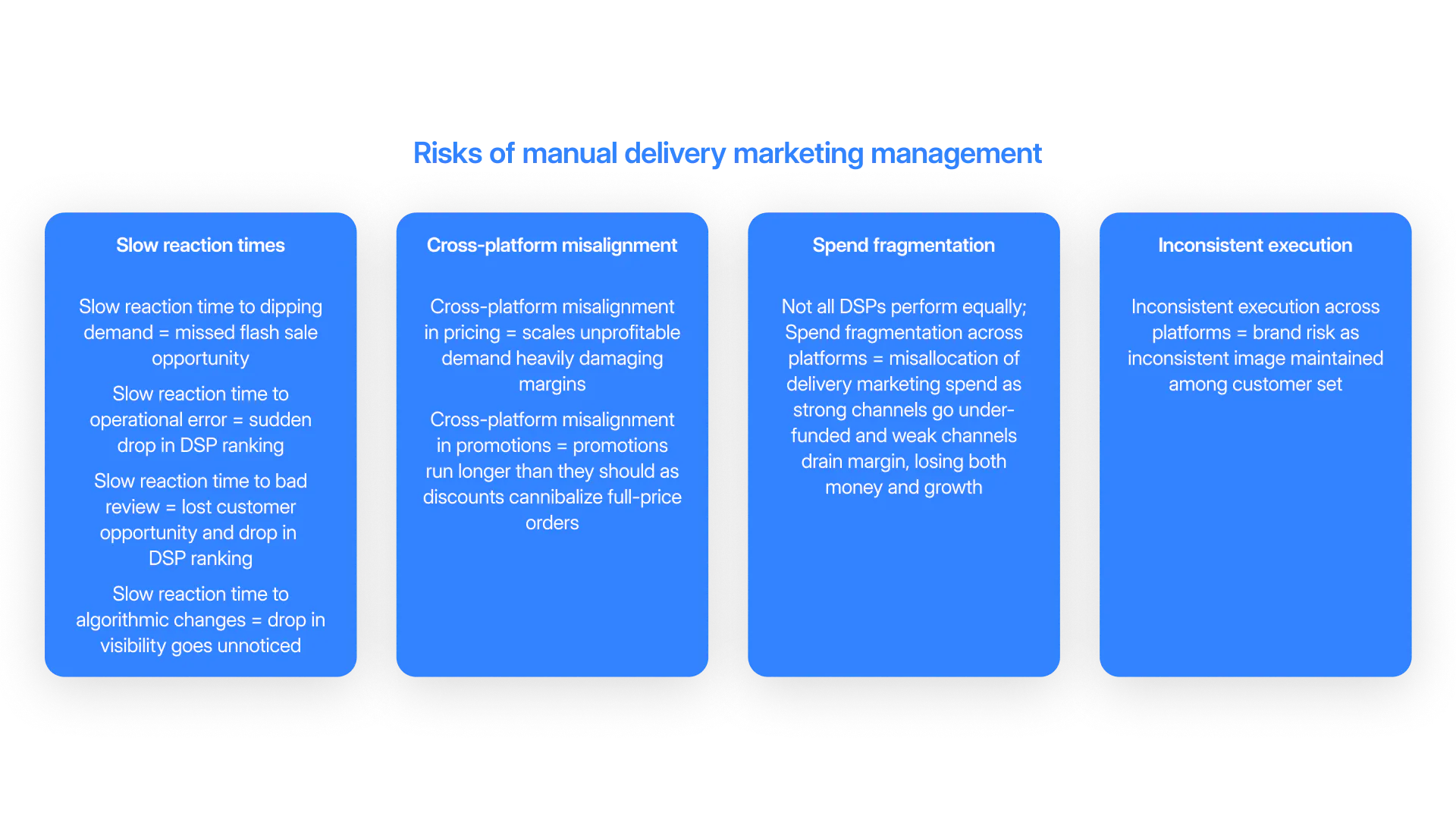 This directly addresses the core failure modes of manual delivery marketing: slow reaction times, inconsistent execution, margin erosion hidden behind top-line growth, and cognitive overload as scale increases.