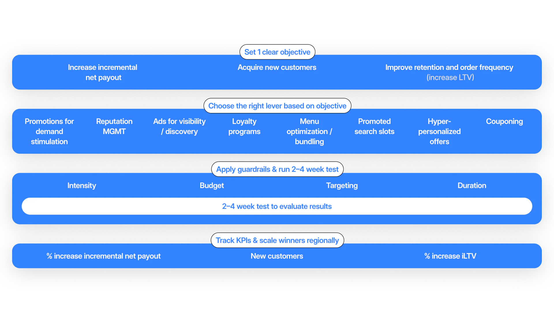 Each location operates in a unique micro-market. AI systems analyze store-level performance - order volume, conversion, ranking, payout - and select promotions tailored to that specific location rather than copying national campaigns blindly.